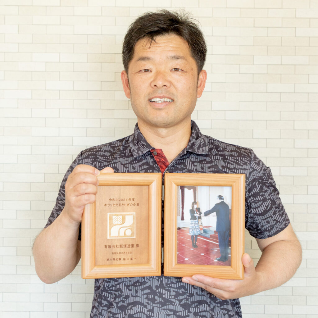 この度、令和3年度(2021年度)「キラリと光るとちぎの企業表彰」を受賞いたしました。 この企業表彰は、独創的な商品・サービスの提供や、高い技術力による製品製造などで地域活性化に貢献した中小企業が表彰される制度として、平成28年度から始まり、今回で6回目となります。 大小の石と植栽を組み合わせた「ロックガーデン」を推進し、オンリーワンな庭づくりと技術の継承に取り組んでいることが評価されました。 福田富一知事から「他社ではまねのできない高い技術力による製品の製造や新たな事業承継などにより、本県経済の成長や地域コミュニティの活性化に多大な貢献をいただき、敬意を表します。本県を代表する『キラリと光る』企業として、他の中小・小規模企業の皆様のチャレンジ意欲の喚起や地域活性化につながることを期待します」と激励の言葉が贈られました。 今後も地域に根差した事業展開を通じて地域活性化への貢献を目指して参ります。