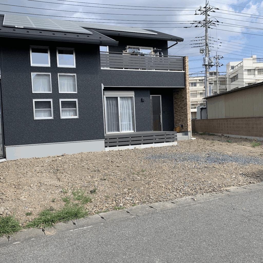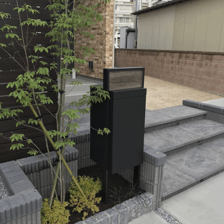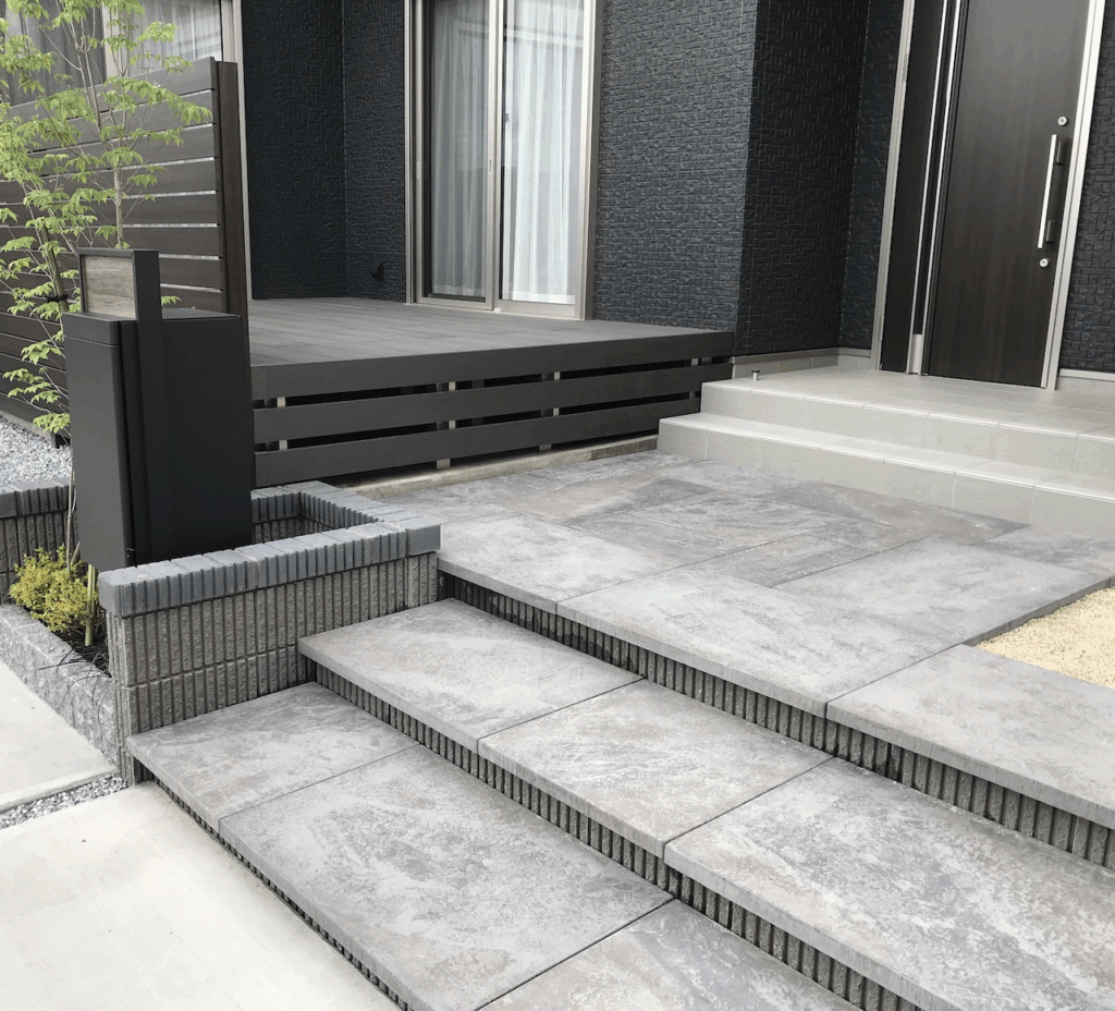 個人様邸外構が完成しました。素敵な石の階段と実用的な広い駐車スペースがある、考え抜かれた外構デザインとなっています!