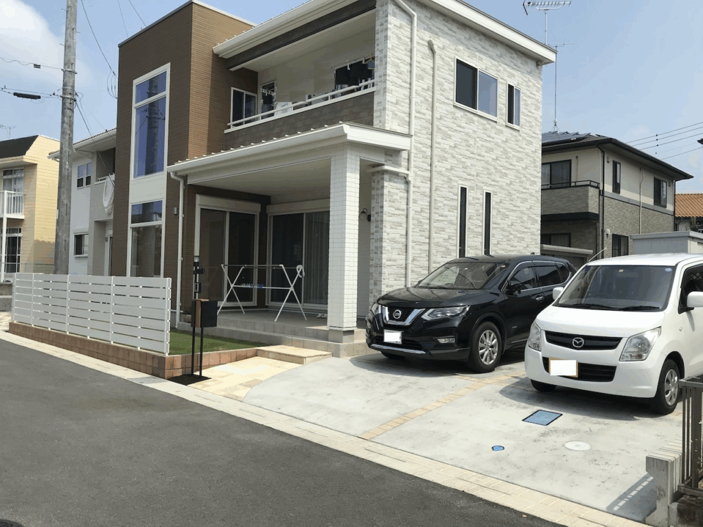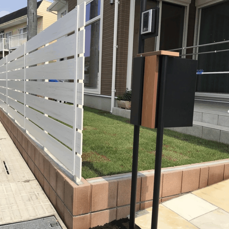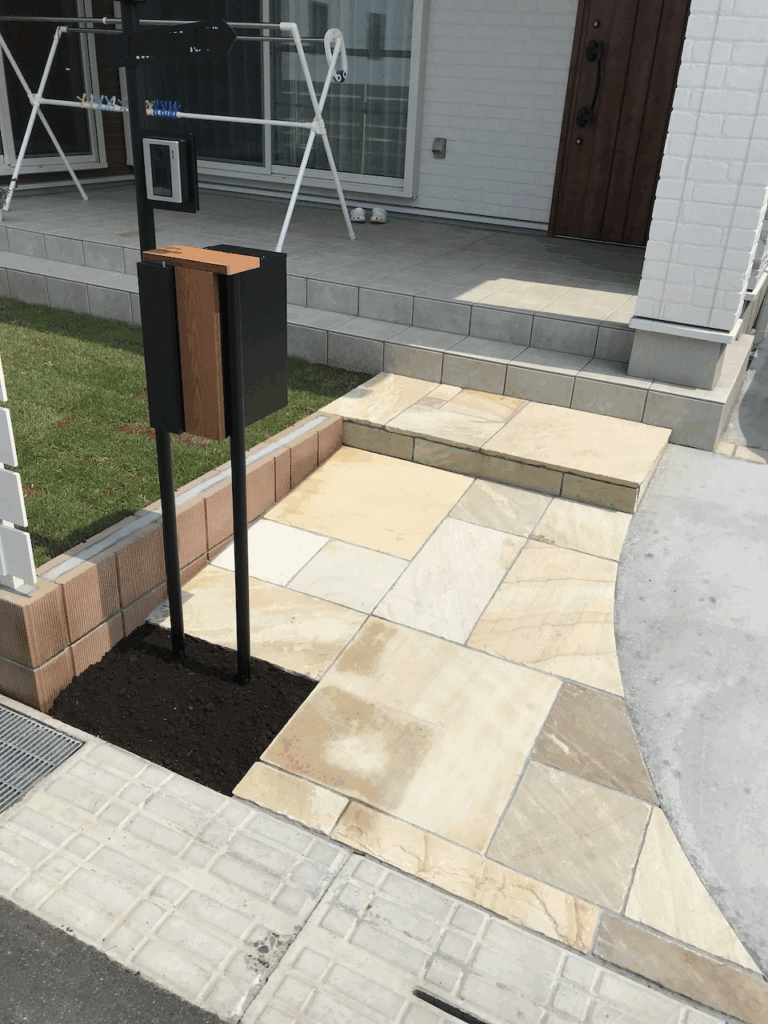 可愛らしい家の外観と調和したお洒落な庭が完成しました。「子供たちを芝生で安心して遊ばせたい」「圧迫感を感じずに視線を遮りたい」というご要望をいただき、板張りフェンスの色や高さを調整しました。アプローチは、色幅を楽しむことができる自然石の砂岩を使用し、とてもお洒落に仕上がっています。様々な機能を持ち合わせたスタイリッシュな門柱は、お客様のこだわりポイントです。