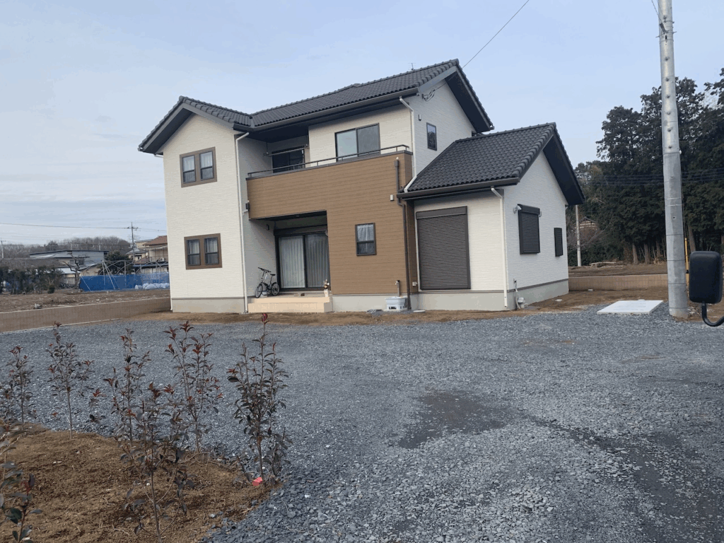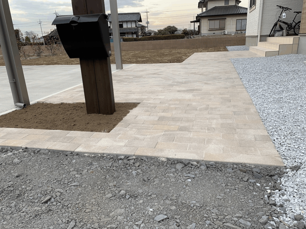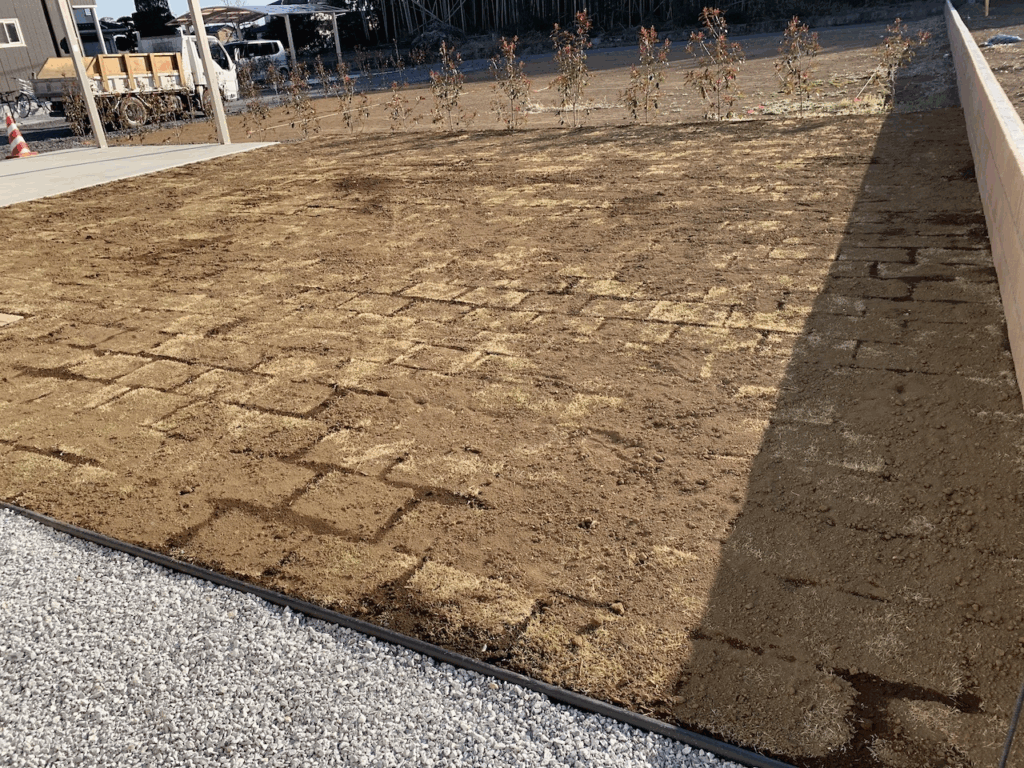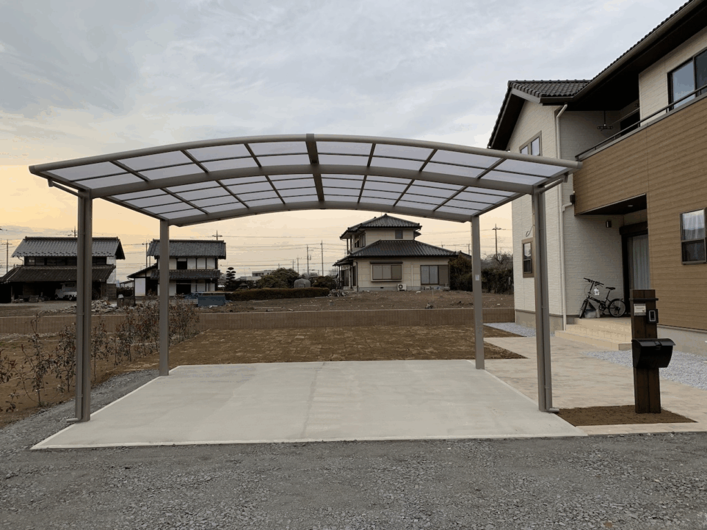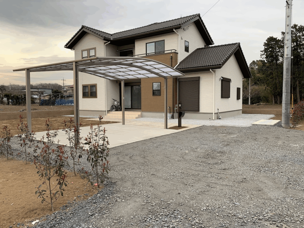 個人様邸外構工事が完成しました。ハイルーフのカーポートは、大きな車も安心して駐車できます。広い芝生はこれから徐々に根付いて青々と変化していくのが楽しみですね。