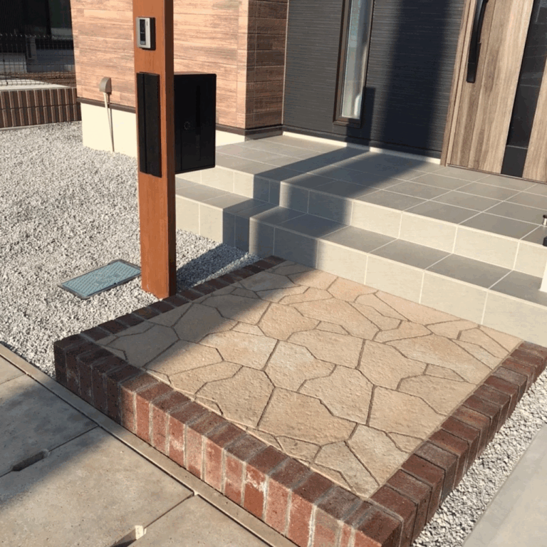 個人様邸にて、乱形の石張りを表現したインターロッキングを施工しました。レンガの小端立てとも相性が良く、玄関アプローチにおしゃれなアクセントを加えたデザインとなりました。お客様のご要望に合わせてより満足していただけるお庭をデザインします。お気軽にご相談ください。