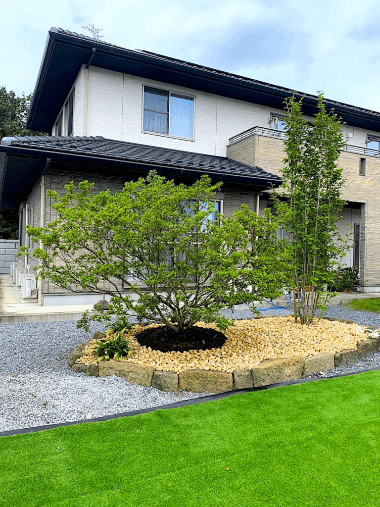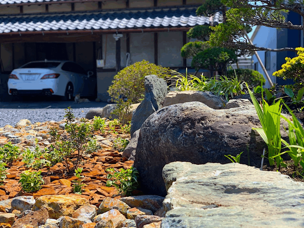 個人様邸のリガーデンを手掛けさせていただきました。同じ石でもその据え方によっては、ただ石が置かれているだけの風景になったり、とても魅力的な風景になったりします。豊富な経験と技術によって石の角度や配置を決めながら、その同じ石が魅力的な景石となるよう施工させていただきました。やっぱり樹木と自然石が織りなす庭の風景は、とても魅力的ですね。