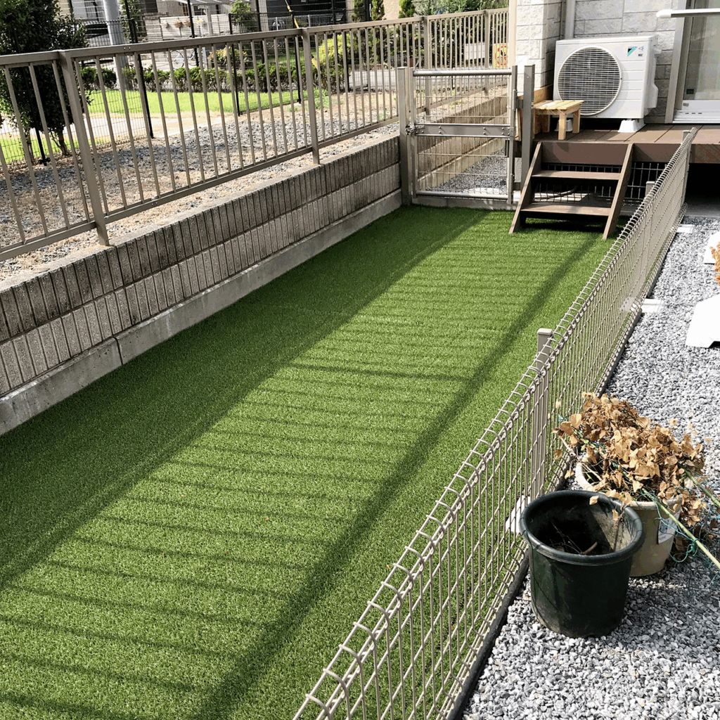 ドックランに敷いた人工芝はクッション性が高く愛犬の足や腰にかかる負担を軽減。さらに、愛犬が寝転んでも泥汚れや害虫が付きにくく衛生的。