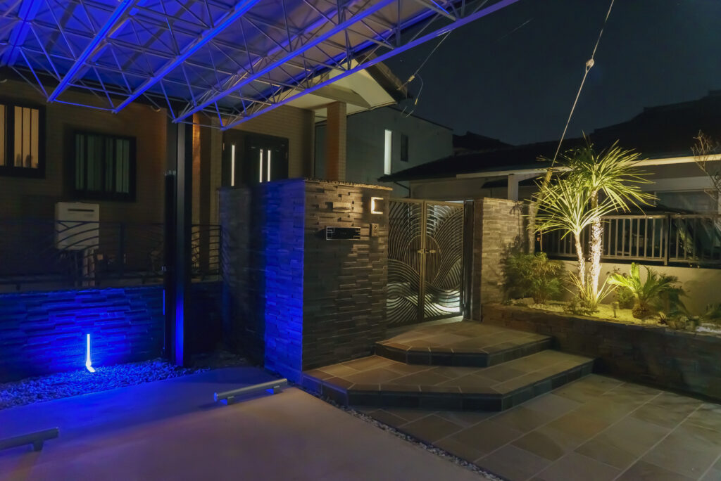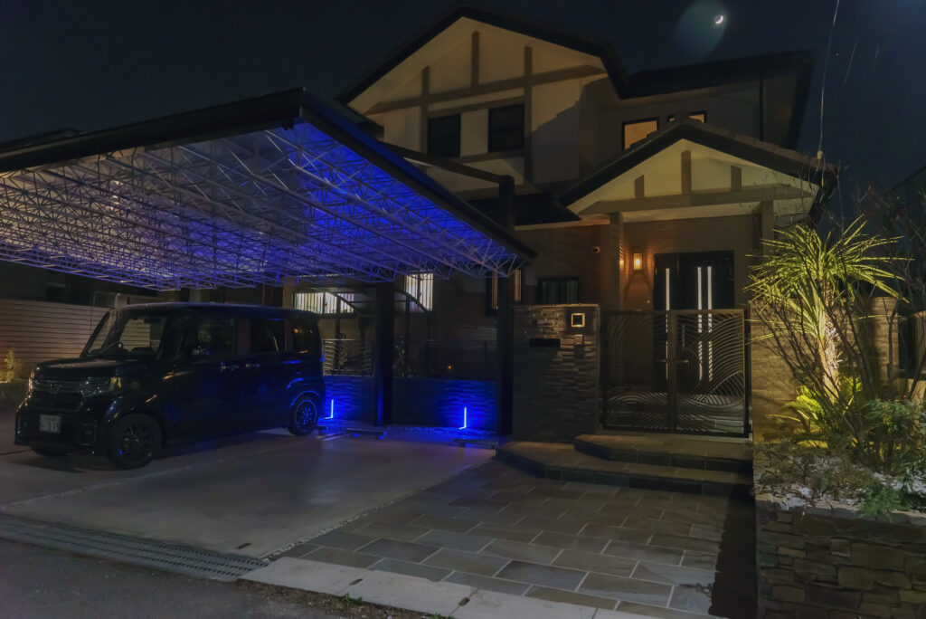 三協アルミのカーポート【M.シェード】の特徴的なトラス屋根に、L型埋込ライトの青い光が反射して美しい演出が出来ました。