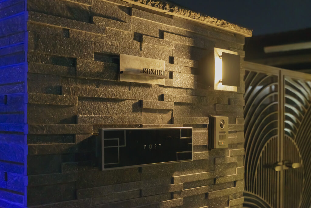 お家周りに街灯が少ないため、夜も玄関前が明るくなるようライティングをご希望された施工事例です。