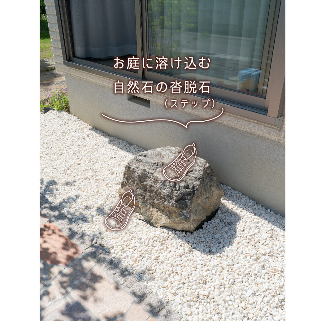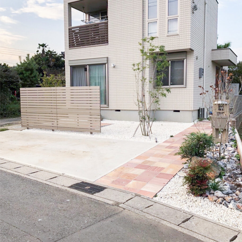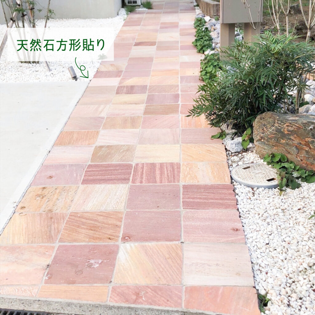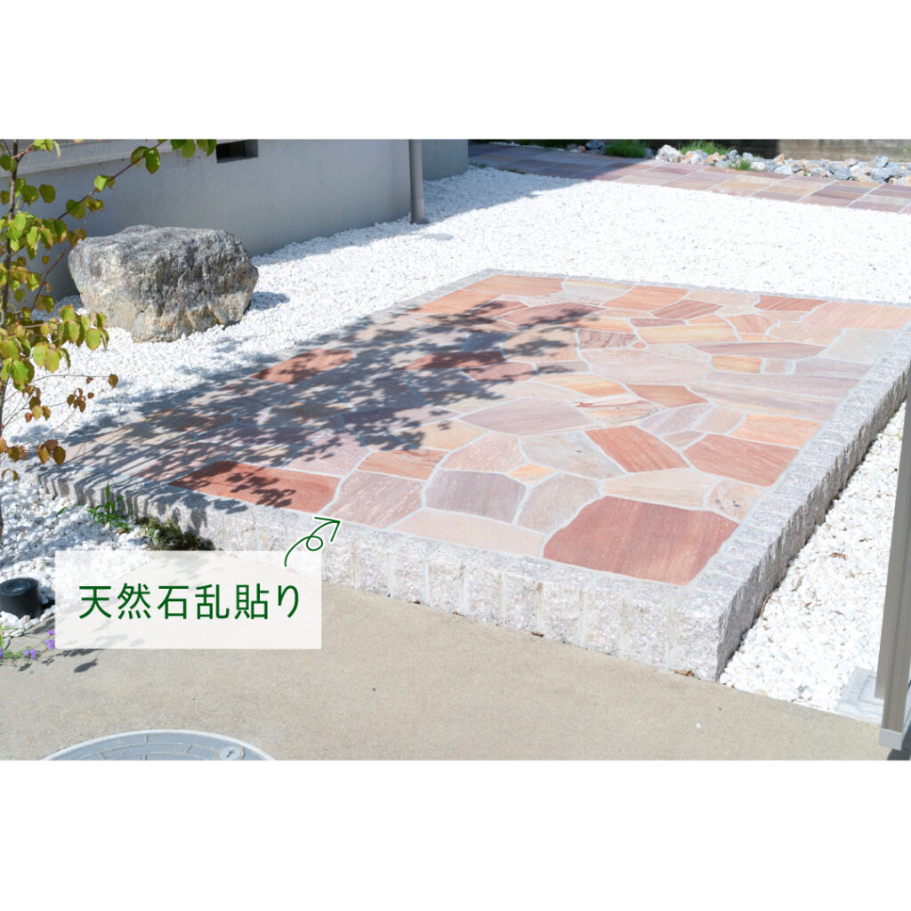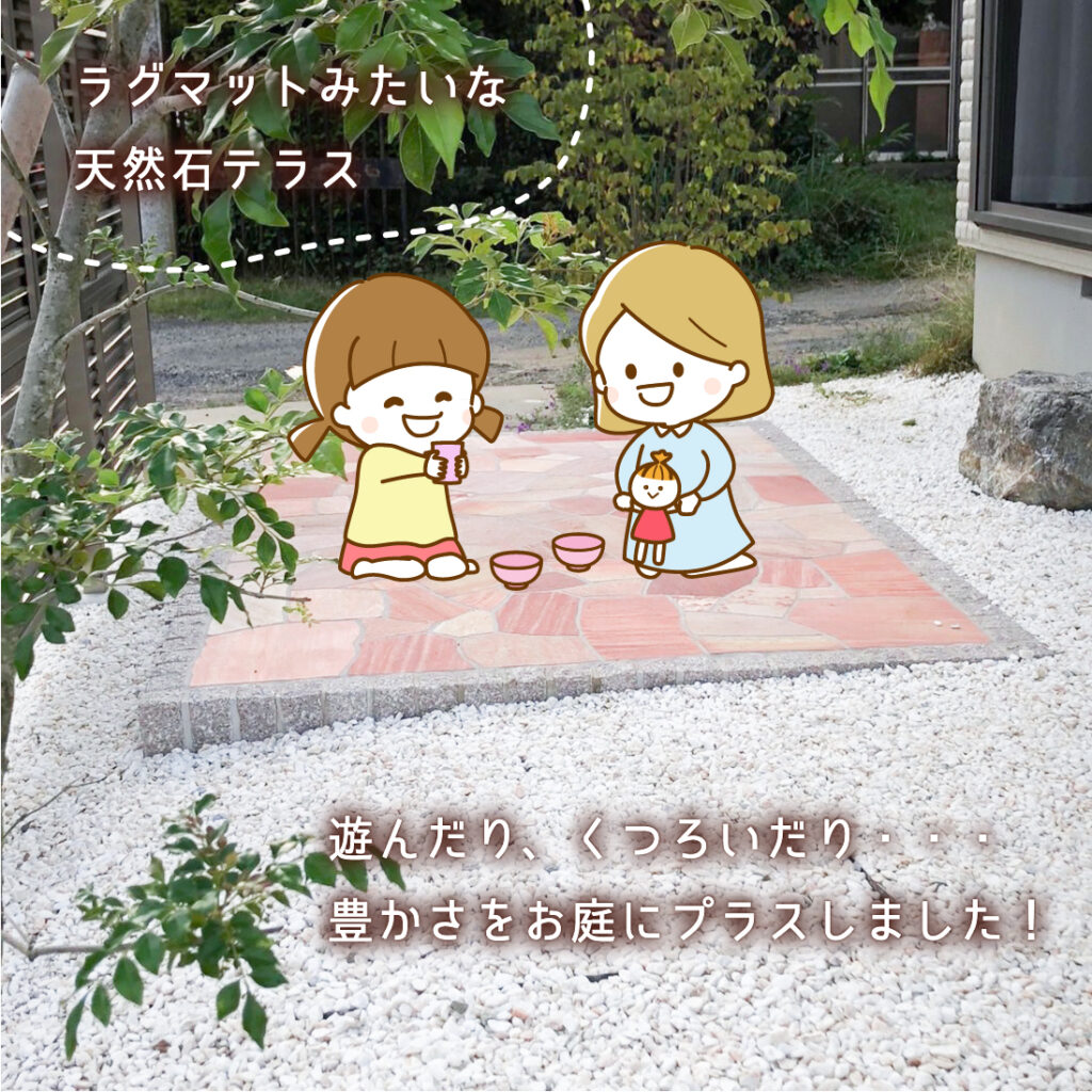天然石のアプローチとテラスを同じ素材で統一することで、お庭のアクセントカラーとして使用しました。